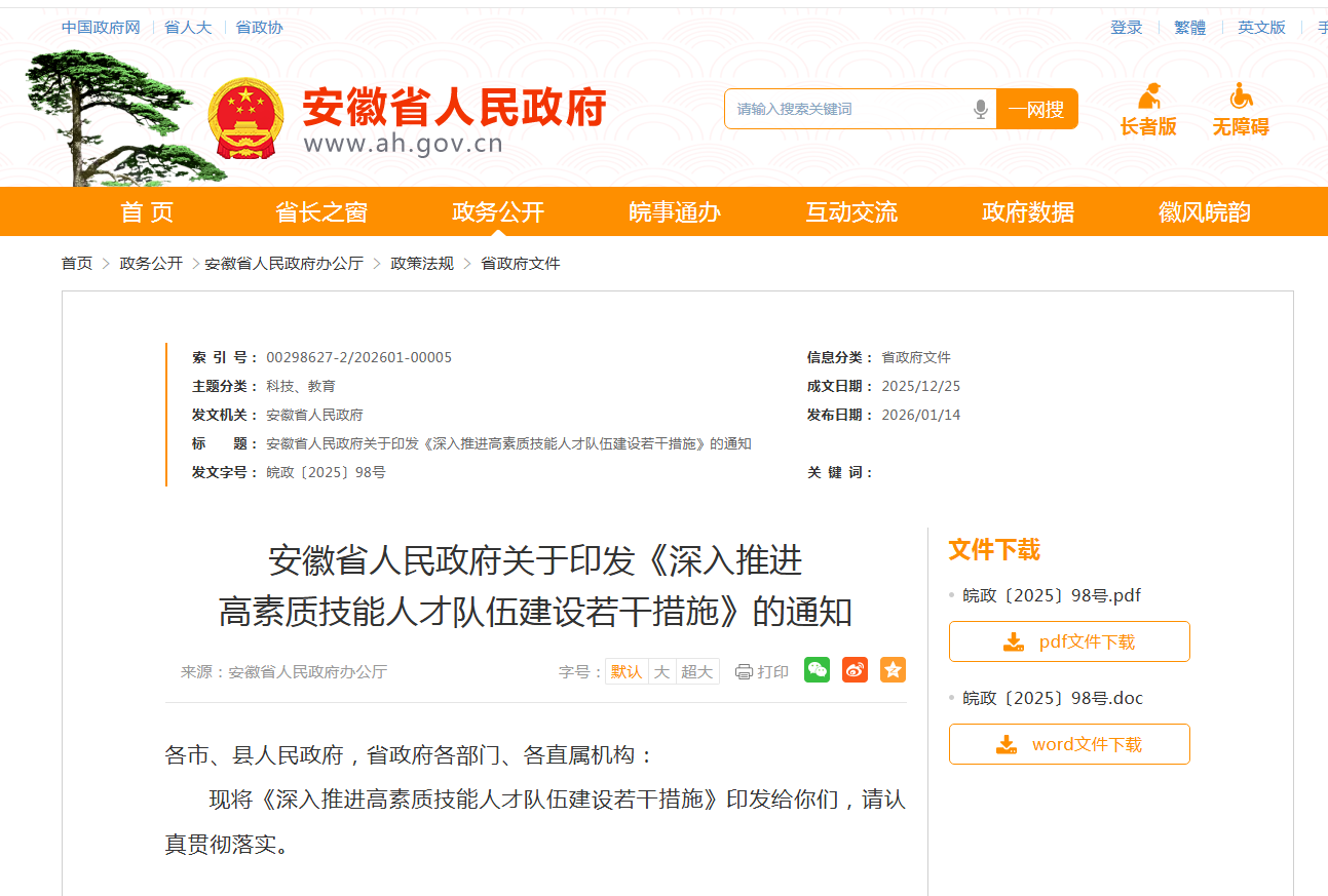 安徽省人民政府关于印发《深入推进高素质技能人才队伍建设若干措施》的通知